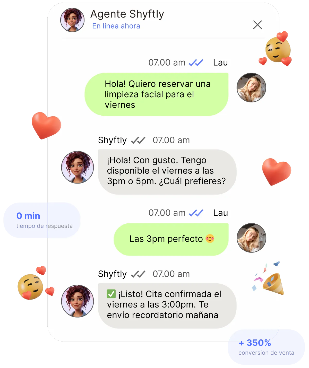 El agente no solo informa convierte. Responde objeciones y guía al cliente hasta que confirma su cita o servicio.